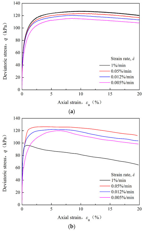 Figure 12 shows the deviatoric stress–axial-strain curves for the flocculated and dispersed samples under different strain rates. For the flocculated samples, the corresponding peak deviatoric stresses under strain rates of 0.005, 0.012, 0.05, and 1%/min is 115.64 kPa, 120.53 kPa, 123.62 kPa, and 127.70 kPa, respectively. At the same axial strain, the deviatoric stress increased as the strain rate increased. The peak deviatoric stress at a strain rate of 1%/min is approximately 10% higher than that at a strain rate of 0.005%/min. The initial development of the deviatoric stress in the dispersed samples was faster than that in the flocculated samples. For the dispersed samples, the corresponding peak deviatoric stresses under strain rates of 0.005, 0.012, 0.05, and 1%/min is 120.20 kPa, 122.27 kPa, 126.47 kPa, and 96.47 kPa, respectively. It can be observed that the faster the strain rate, the smaller the axial strain value required to reach the peak deviatoric stress. The peak deviatoric stress at the strain rate of 0.05%/min was approximately 5% higher than that at the strain rate of 0.005%/min. Similarly to the flocculated samples, the peak deviatoric stress in the dispersed specimens increased with the strain rate.