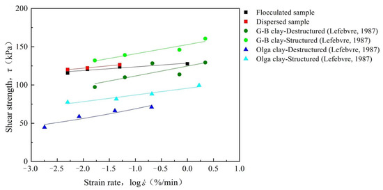 Lefebvre [36] conducted triaxial undrained shear tests on structured and destroyed samples of Grande-Balene (G-B) clay and Olag clay at various strain rates to obtain the shear strengths of un-disturbed and re-moulded clays at different strain rates. Combining this finding with the shear strength data of the two structured kaolin samples at different strain rates, the relationship between the shear strength and strain rate for different types of clay is shown in Figure 13. The stronger the structure of the clay, the higher its shear strength, and the relationship between the shear strength and strain rate aligns with Equation (8).