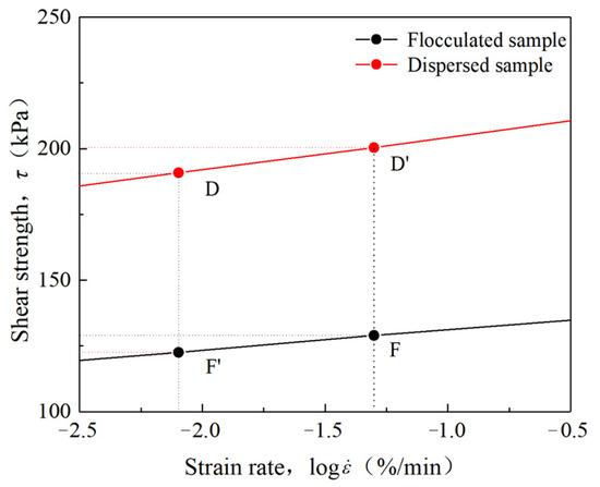 Pillai et al. [19] conducted triaxial undrained shear tests on flocculated and dispersed samples at the strain rates of 0.07%/min and 0.05%/min, respectively. The results showed that under an effective confining pressure of 200 kPa, the shear strength of the dispersed sample was 25.81% higher than that of the flocculated sample. Sachan [18] calculated the strain rates for flocculated and dispersed samples as 0.05%/min and 0.008%/min, respectively, using Equations (1)–(3). At these strain rates, the shear strength of the flocculated sample and dispersed sample is 129.02 kPa and 190.85 kPa, respectively. The shear strength of the dispersed sample is 47.94% higher than that of the flocculated sample. The kaolin used by Sachan was commercial kaolin (SC-25) with a liquid-limit moisture content of 62%, plasticity index of 30%, and specific gravity of 2.63. Based on the consolidation curves, the Ca/Cc values for the flocculated and dispersed samples are 0.0260 and 0.0275, respectively, calculated by Equation (9), the strain rate sensitivity parameters for the flocculated and dispersed structure samples are calculated to be 6.17% and 6.54%, respectively. both fall within the range of 5.9% to 12.2% proposed by Mesri and Godlewski [37]. The strain-rate sensitivity parameters of the dispersed and flocculated kaolin samples were similar. For SC-25 kaolin, an increase in the strain rate by a factor of 10 increased the undrained shear strength by approximately 6%. Based on these data and Equation (8), the plots of the shear strength and strain rate for the two SC-25 kaolin structures are shown in Figure 14. If the strain rates used in this study were 0.05%/min for the flocculated sample (point F) and 0.008%/min for the dispersed sample (point D), the shear strength of the dispersed sample would be 47.94% higher than that of the flocculated sample. If both structural samples were tested at a strain rate of 0.05%/min (points D′ and F), the shear strength of the dispersed sample would be 56.22% higher than that of the flocculated sample. If both structure samples were tested at a strain rate of 0.008%/min (points D and F′), the shear strength of the dispersed sample would be 55.34% higher than that of the flocculated sample.