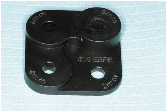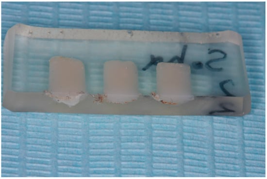 Sonic fill specimens were dispensed into the mold using their proprietary ultrasonic delivery system to adjust viscosity. Ten specimens were prepared for each of the six composites. The mold was placed over a celluloid strip, covered with a glass slide, and filled with composite resin, and then another celluloid strip and glass slide were placed on top. This assembly was compressed using a hydraulic press to eliminate excess material and minimize internal porosity. The glass slide was removed, and the composite resin was polymerized for 20 s using the respective LCU. After polymerization, specimens were scraped to remove uncured material, and therefore they did not possess the same length. They were then embedded in a cylindrical mold filled with epoxy resin and allowed to set for 24 h. Specimens were then sectioned longitudinally using a low-speed diamond saw under water cooling (Buehler Isomet, Diamond Cut-off Wheel MOD10, Struers, Copenhagen, Denmark) to produce rectangular slabs containing the specimens cut longitudinally, maintaining perpendicularity to the top surface and staying parallel to the specimen’s long axis (Figure 2 and Figure 3). The slabs were polished using 600-grit metallographic abrasive paper under water cooling (Dap V, Struers) to create a flat surface with minimal roughness, suitable for accurate indentation measurements. Specimens were stored at 37 °C for 24 h before testing.