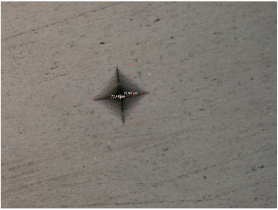 Vickers hardness measurements were performed using a Vickers indenter (Vickers pyramid: diamond right pyramid with a square base and an angle of 136° between opposite faces at the vertex) with a 200 gf (1.96 N) load and a 15 s dwell time (HMV 2000, Shimadzu Corp., Tokyo, Japan). Indentations were made longitudinally on each specimen at depths of 0.5 mm, 1 mm, 2 mm, 3 mm, 4 mm, 5 mm, and, where possible, 6 mm and 7 mm from the irradiated surface (Figure 2 and Figure 3). Three indentations were created at each depth and averaged. Measurements of indentation diagonals were taken under an optical microscope (Leica DM4000 B, Leica Microsystems CMS GmbH, Mannheim, Germany), and Vickers hardness (VH) was calculated using the formula VH = 1.8544 × Fd2VH = 1.8544\times\frac{F}{d2}VH = 1.8544 × d2F, where FFF is the applied load (kgf) and ddd is the average diagonal length of the indentation (mm) (Figure 4).