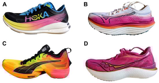 CPRS models used in this study. (A) Hoka Rocket X2 (HOK), (B) Mizuno Wave Rebellion Pro (MIZ), (C) Puma Fast-R Nitro Elite (PUM), and (D) Saucony Endorphin Pro 3 (SAU).