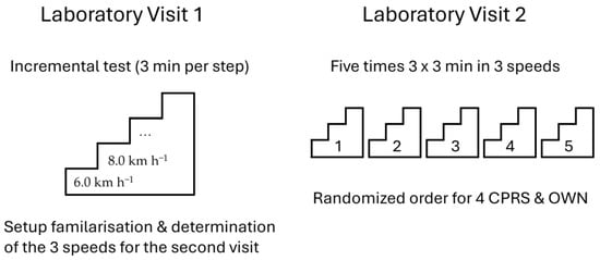 A randomized cross-over design was used to assess the effect of four different CPRS models on RE with participants attending two separate laboratory visits (Figure 2). The primary aim of the first visit was the determination of running speeds at ventilatory threshold 1 (vVT1) and at ventilatory threshold 2 (vVT2), while also serving as a familiarization period with the experimental setup. The subsequent visit was used to measure running economy in the five different footwear conditions in randomized order at the three individual running speeds v1 = 90% , , and v3 = 100% . The associated intensities of “easy” (v1), “threshold” (v2), and “competition” (v3) were chosen to assess RE throughout a wide range of speeds that are typically used by runners in training and racing. The 3 min interval duration was chosen because it represents the shortest possible time after which steady-state oxygen consumption is likely to be reached, ensuring accurate RE measurement while, at the same time, keeping fatigue at an acceptable level [38]. Runners were instructed to abstain from strenuous exercise for at least 48 h prior to both laboratory visits and were encouraged to match diet and sleep patterns as closely as possible between visits 1 and 2.