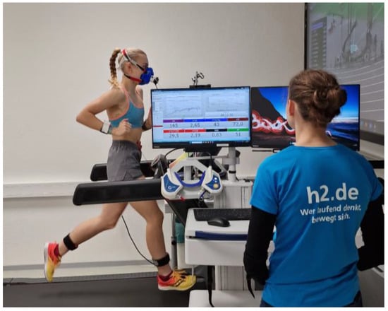 During the first visit, participants’ anthropometric measures and baseline physiological values were collected. Participants then put on their own training shoes (ensuring they were not AFT) and were placed on a motorized treadmill (Star Trac FreeRunner 10TRx, Core Health 6 Fitness, Vancouver, BC, Canada), which was set at a 1% incline to compensate for the absence of air drag [39]. The subjects were equipped with a heartrate monitor (Polar H10; Polar Electro Oy, Kempele, Finland) and an appropriately sized face mask (7450 Series V2 Mask; Hans Rudolph, Inc., Shawnee, KS, USA) connected to a metabolic cart (MetaMax 3B, CORTEX Biophysik GmbH, Leipzig, Germany), providing continuous breath-by-breath cardiopulmonary gas exchange measures (Figure 3). In this experimental setup, each participant completed a standardized incremental protocol defined by a starting speed of 6.0 km h−1 (same for all participants), 3 min stage duration, and increments of 2.0 km h−1 until voluntary exhaustion was reached. Upon completion of the incremental test, vVT1 and vVT2, as well as peak aerobic capacity (), were determined. The speeds vVT1 and vVT2 were used to calculate the three running speeds v1, v2, and v3 for assessing RE during visit 2. Laboratory visits 1 and 2 were separated by at least 48 h and used the same laboratory and experimental setups during both visits.