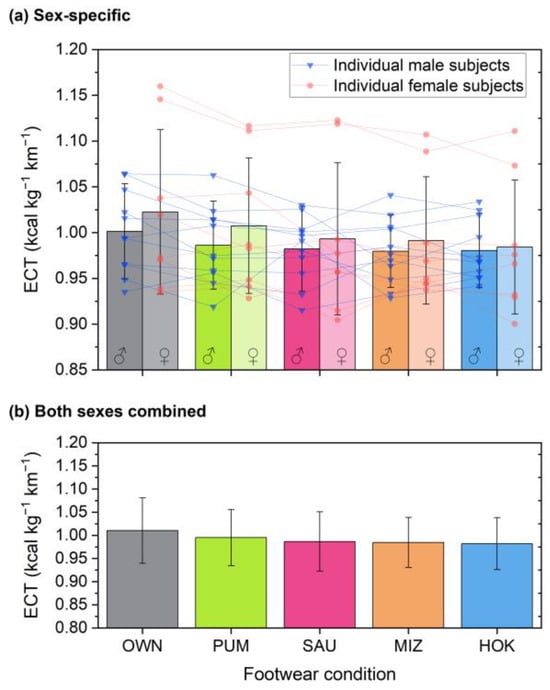 As for the mixed cohort of both sexes, ECT results are summarized in Figure 4b and Table 2. ECT was not affected by the shoes’ order (F = 1.666, p = 0.167), while the footwear condition significantly affected ECT averaged across intensities (F = 7.136, p < 0.001). ECT was significantly reduced by 0.03 kcal kg−1 km−1 for HOK (2.80%, pHolm < 0.001, and dCohen = 0.90), 0.03 kcal kg−1 km−1 for MIZ (2.57%, pHolm < 0.001, and dCohen = 0.60), 0.03 kcal kg−1 km−1 for PUM (2.31%, pHolm < 0.001, and dCohen = 0.80), and 0.02 kcal kg−1 km−1 for SAU (1.52%, pHolm = 0.016, and dCohen = 0.42). Reductions by HOK and SAU were large in magnitude, whereas the effects of ECT reductions by MIZ and PUM were moderate and small, respectively.