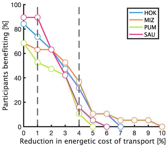 Percentage of subjects that experienced average metabolic savings between 0 and 10% in CPRS conditions. HOK = Hoka Rocket X2, MIZ = Mizuno Wave Rebellion Pro, PUM = Puma Fast-R Nitro Elite, and SAU = Saucony Endorphin Pro 3. The dashed lines depict the thresholds of savings of 1% and 4%, respectively.