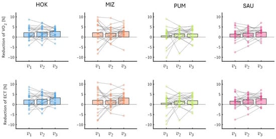 Effects of CPRSs on measures of RE showed considerable inter-individual variability (cf. Figure 4a). Mean effects of CPRSs on ECT ranged from −1.7 to 6.5% for HOK, −2.5 to 9.4% for MIZ, −2.2 to 4.9% for PUM, and −4.5 to 5.8% for SAU among individuals. In summary, 21% of all subjects reached their individually best relative reduction in ECT wearing HOK, 32% wearing MIZ, 16% wearing PUM, and 32% wearing SAU, respectively.