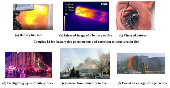 Diverse scales of LIB fire: (a) Experimental evaluation of battery ignition scenarios; (b) thermal imaging of a battery fire test; (c) post-combustion charred battery; (d) suppression measures during fire events; (e) battery fire in a commercial building; and (f) energy storage facility fire [8].