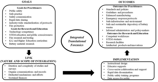 Braxtan et al. [8] first introduced the concept of translational research for LIB fire, described as translational forensics. They proposed some general rules and stages for integrated studies of Li-ion battery hazards (hence, forensic science); these are based on goals for practitioners, research, and education and their connections and outcomes. These are presented in Figure 3.