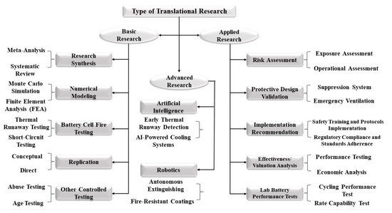 Figure 4 further outlines the necessary research endeavors and the knowledge advancement process to produce valuable insights into LIB fire safety. These research endeavors can be cleaved into basic, applied, and advanced measures for research. There is also a potential to introduce hybrid methods that combine different research stages, which could yield greater benefits earlier in the process. For instance, integrating numerical modeling (basic research) with risk assessment (applied research) in a collaborative study may be an effective way to accelerate translational work. There are several examples in system design that involve combining various tasks to create concurrent outcomes. Figure 5 illustrates the diverse steps in translational research and the levels of development regarding battery behavior. These levels should account for varying structural complexities, from individual cells to modules and complete battery racks.