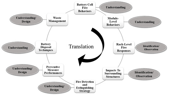 Because LIB technology implementation is occurring at such a rapid pace, the biggest challenge is to bring awareness of battery fire issues and research outcomes to industry applications and the public. Herein, the accelerated transfer of technical knowledge to practitioners, also referred to as translational forensics, is suggested for the LIB technology industry. Translational research in an industry aids in sharing technical knowledge across all sectors, which the medical field calls a “bench-to-bedside” transfer [9,10]; this can be equally beneficial to the battery fire management field, coined “cells-to-infrastructure”.