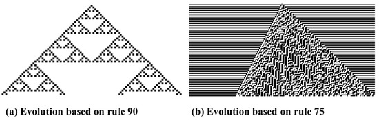 Cellular automata, initially conceptualized by von Neumann [32], represent extensive discrete dynamical systems characterized by their simple structure, yet capable of exhibiting complex and varied behaviors. These models consist of cells organized in a grid that evolves according to rules based on the states of neighboring cells. They reveal how intricate patterns can emerge from simple local rules and have found applications in various fields such as physics, biology, and computer science, particularly for simulating patterns and processing information [33]. The complete structure of state transition diagrams is formulated using algebraic and theoretical principles. In its simplest form, a cellular automaton consists of a linear arrangement of sites, each assigned a binary value of 0 or 1. These values progress through synchronous evolution across discrete time intervals, influenced by the states of neighboring sites. For example, a common rule of evolution dictates that a site’s value at a given timestep is computed as the sum of its nearest neighbors’ values from the previous timestep, with the rule applied simultaneously at each site [34].