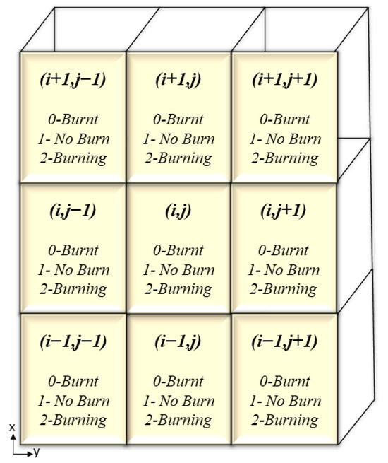 It is important to highlight that the program ensures grid updates by referencing the previous state, thereby preventing any interference. Additionally, the incorporation of random numbers introduces an element of unpredictability, mimicking the uncertainty inherent in real-world fire propagation. Equation (1) presents a simplified model of fire ignition that is commonly employed in fire simulations. More sophisticated models have been developed in other domains such as market pricing modeling [37]. The underlying principle governing fire propagation is outlined in the algorithm depicted in Figure 9.