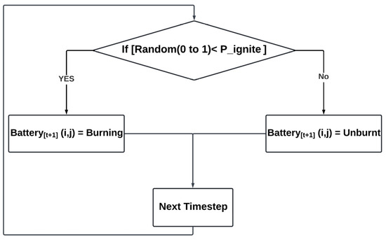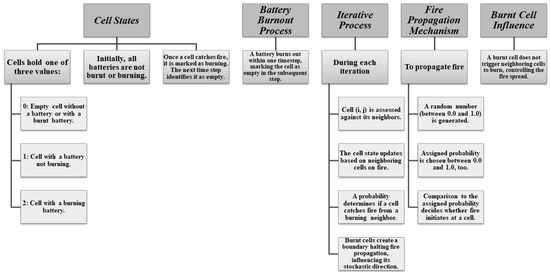 The complete process flow is depicted in Figure 8, categorizing the cell states into three types: 0 for empty or burnt battery cells, 1 for non-burning battery cells, and 2 for burning battery cells. Once ignited, a cell transitions to a burning state and subsequently becomes empty in the following timestep, as battery burnout occurs within a single timestep. During each iteration, the state of a cell is influenced by its neighboring cells, with a certain probability determining ignition from adjacent burning cells. Burnt cells serve as barriers to the spread of fire, influencing its direction. Fire spread is based on a comparison between a generated random number and the probability of ignition, . Fire propagates from burning cells to neighboring unburnt cells with a defined probability, . For each unburnt cell, the number of burning neighbors is calculated, with the likelihood of ignition increasing as the number of burning neighbors rises. The probability that an unburnt cell will catch fire is expressed as follows: