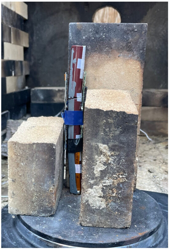 An experimental study was performed to calibrate the battery fire propagation with actual battery fire scenarios. Three cylindrical INR (Lithium Nickel Cobalt Manganese Oxide, NMC) 18650 battery cells (Samsung SDI, Yongin-si, Republic of Korea), each at 100% state of charge (SOC), were tested in series with positive-to-negative end alignment. The cells were placed in direct contact, with no spacing between them, to simulate a worst-case scenario that maximizes thermal interaction between the cells. This configuration mirrors real-world applications, particularly the fire propagation in compact battery arrangements found in consumer electronics such as laptops. The cells were secured together with tape wound around the circuit board strips acting as supports along the edges of the cells. An Oster electric hotplate was used to induce thermal abuse, facilitating and simulating a real-world LIB failure mode during the experimental tests. The bottom cell was in contact with the hot plate through its negative end cap, directing any potential positive end-fire event upward into the cell above. Type-K thermocouples were affixed at mid-height positions along the length of each cell. The thermocouples were connected to an Omega signal conditioner, which converted the signal for the node device. The node transmitted data to a gateway located at a safe distance, connecting via USB to the monitoring computer. Data were logged and displayed in real time using SmartConnect and National Instruments Compact Data Acquisition (DAQ). The experimental setup is shown in Figure 10.