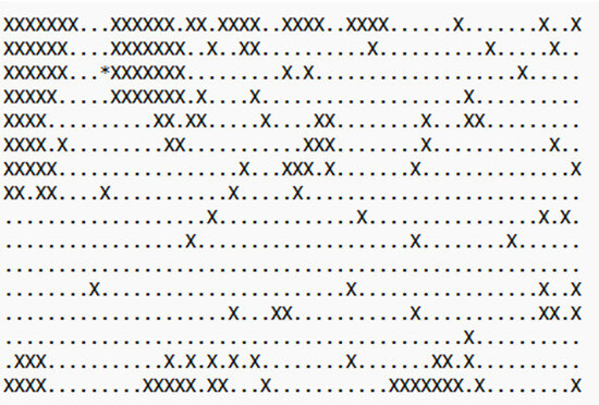 Example of map of fire damage in simulation: Fire started at “*”; burnt batteries are indicated by “.”; and unburnt batteries are indicated by “X”.