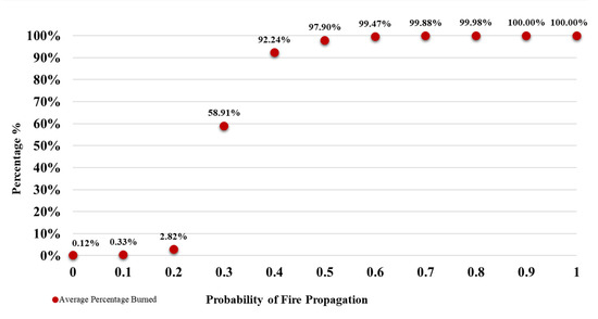 Using the recorded time from the experiment as an estimation for each timestep in the simulation, the actual time of burn at the module level is formulated for different fire propagation probabilities: