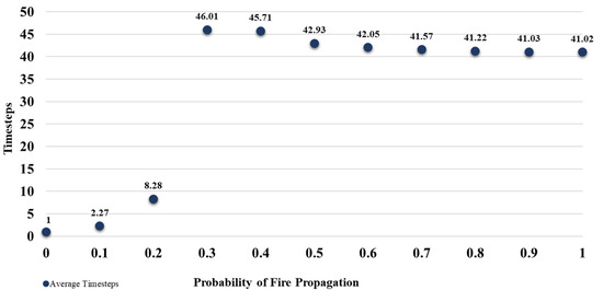 With respect to the rise in the probability of fire propagation, at 0.3 probability, more than half of the battery module will be lost. Also, at 0.6 probability, the fire will spread to almost the entire module by about 99.47%. The average timesteps of fire propagation from the simulation at 0.6 probability, which leads to approximately total burn, are calculated to be about 42 steps.