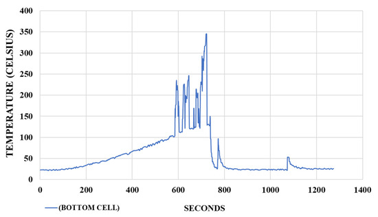 Figure 14 shows the temperature variation observed during the experiment in the bottom battery cell. The maximum temperature recorded throughout the test was 345.5 °C. The bottom cell exhibited multiple temperature peaks due to the multi-stage thermal runaway processes, along with the continued thermal input from the cells positioned above it.