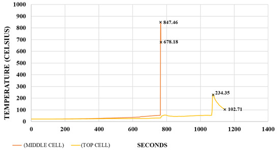 Figure 15 shows the temperature variation over time for the middle and top battery cells, where the maximum temperature recorded was 847.46 °C, and 234.35 °C, respectively. It should be mentioned that after the fire event progression, the thermocouple attached to the middle cell detached due to the ignition process. However, the cooling process was captured, where a temperature of 678.18 °C, approximately 11 s after the second ignition, was recorded. The drastic increases in the temperatures of the middle and top cells are attributed to the occurrence of fire events.