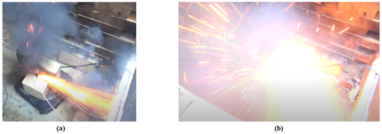 The first and second fire event snapshots: (a) Moment of 1st ignition bottom cell, initial sparks [13:22 (vid.), 757 s (data)]; (b) Moment of 2nd ignition, 2nd cell, sparks [1:24 (2nd vid.), 1061 s (data)].