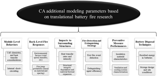 With further development in modeling techniques, the current CA-MC modeling can be extended to several other aspects of battery fire science and management studies. Drawing parallels from the forest fire literature, where CA has been applied to simulate fire propagation and fire prevention, this modeling technique applies to different aspects of LIB technologies. Figure 17 illustrates the different simulation parameters required for extending CA modeling to different aspects of battery fire research including cell chemistry, heat propagation, and factors affecting internal short-circuiting at the cell level, environmental factors and fire jump probabilities at the rack level, heat transfer rate and thermal properties when considering surrounding structures, fire detection and extinguishing, insulation material characteristics and site ventilation design for preventive measures, and residual material characteristics and storage site conditions for battery disposal.