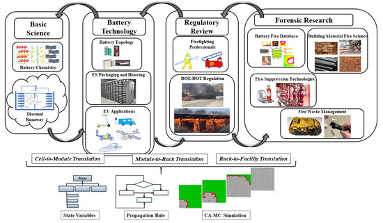 Battery fire at the stack or rack level is a complex physio-chemical phenomenon that involves not only battery chemistry but also includes the packaging design, rack support design, battery management system (BMS) and sensors, cooling system, electronic wiring, and central controls [38,39,40]. The numerical simulation of the entire stack performance during a fire is multi-physical and too complicated for a single numerical modeling scheme. CA-MC modeling simplifies these interactions and can provide an estimate of the time for battery fire propagation. Battery fire research requires the involvement of two key elements: advancements in battery technology development and oversight by a multidisciplinary team of regulatory agencies. However, the transfer of knowledge between agencies can be time-consuming, and instruments (translational research) that can help accelerate interagency collaborations are needed.