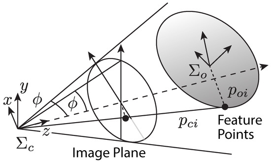 The distance of the furthest feature point from the origin of is denoted as . If the sphere with the radius of centered on the origin of is included in the cone, then all feature points can be measured. Next, we consider a condition
