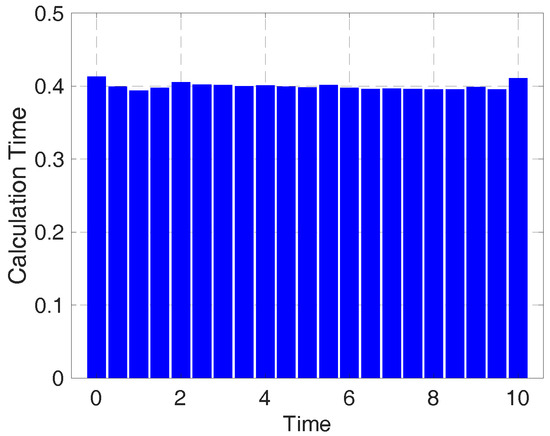 All simulations are performed on a MacBook Air equipped with an Apple M1 chip and 8 GB of RAM. In this simulation, trajectory planning is conducted every s. Figure 7 shows the average trajectory computation time, obtained by planning the trajectories 10 times for each target and robot position at s intervals in the simulation of Figure 8. It can be seen that the trajectory planning for 2 steps is completed in approximately s. Depending on the intensity of the target’s movement, it appears that the algorithm is suitable for real-time implementation.