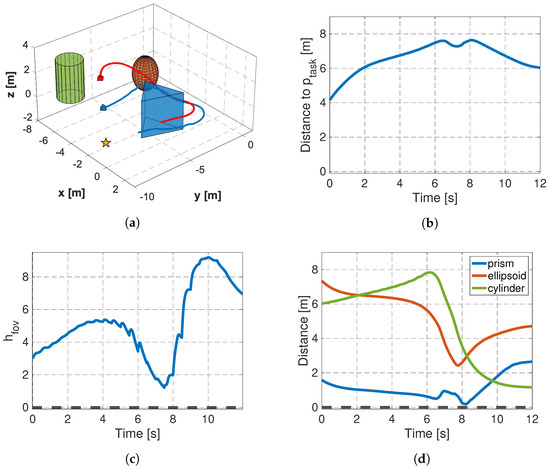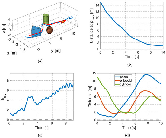 The target location is set to and is indicated by a star in Figure 8a. Three obstacles are placed in the environment, whose shapes are an ellipsoid, a cylinder, and a prism. From Figure 8b, it can be seen that the target object gradually approaches the target location, reaching sufficiently close to it within approximately 10 s.