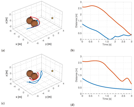 Next, it is verified whether visual safety is maintained. From Figure 9c, it can be seen that remains above 0 at all times, indicating that the target object is consistently kept within the field of view. Additionally, from Figure 9d, it is evident that occlusion avoidance is achieved. Therefore, it is confirmed that the guarding task is successfully completed while maintaining visual safety.