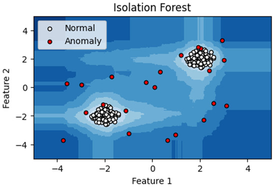 Figure 2 illustrates how RF can be used to detect anomalies in two-dimensional data. Areas of different colors represent different classes, and data points are labeled as normal or anomalous. We can see that the model effectively separates most data points into two classes, with anomalies being found in areas that are less densely populated by data points.
