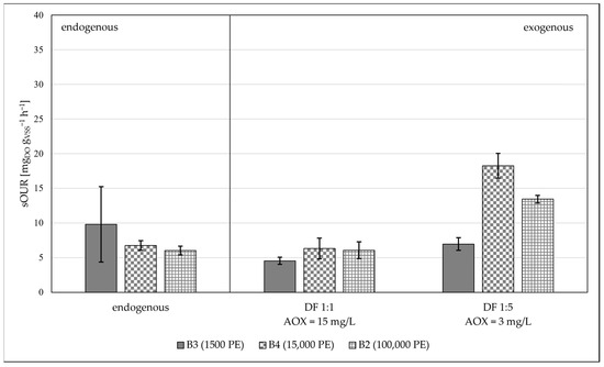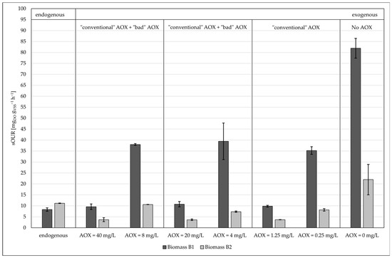 Figure 5 shows that the different types of AOXs—i.e., conventional (natural) AOX and bad (anthropogenic) AOX—had similar short-term oxygen consumption kinetics for both types of biomasses tested (B1 and B2). However, with a higher DF, i.e., a lower concentration of the AOX, the kinetics of the oxygen consumption was higher. Furthermore, it can be observed that biomass B2 showed exogenous sOUR values lower than those of the endogenous one, except for the sample that did not contain any AOX, demonstrating a possible inhibitory effect due to the presence of an AOX.