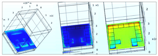 The project in Comsol Multiphysics 5.4 consists of the design of a unit cell layer with a selected (given) geometry of conducting parts on a dielectric substrate (Figure 2), the generation of a mesh against the created unit cell design (Figure 3), and the study of the electromagnetic field distribution against the given physical properties on the designed structure (Figure 4). The application of periodic boundary conditions on the side walls of the model allows us to perform calculations for a single element only, not the whole array of elements. This noticeably reduces the computation time and effort.