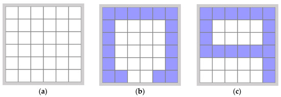 For the purpose of testing the intelligent geometry generation tool, 100 different unit cell designs were designed. It was proposed that each unit cell should have the dimension of a quadrant, which can be divided into the dimensions of 36 smaller square blocks (quadrant dimension 6 × 6 blocks). For each design of a different unit cell geometry, it was assumed that the entire substrate was created from a dielectric and that the 18 blocks consisted of conductive parts. This means that for a unit cell design, 18 blocks made up the non-conductive part (dielectric), and 18 blocks made up the conductive part. This approach was applied to each of the 100 metasurface unit cell designs. An example of the division of a square into blocks and 2 of the 100 different geometries are shown in the example in Figure 5. By default, the block geometries shown are in the unit cell meta-area plotted on the tile at appropriate distances from the edges.