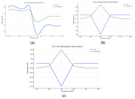 On the basis of the designs of the unit cells of the metasurface (100 proposed geometries), simulations were carried out showing the absorption behavior of specific cell combinations to the microwave frequency range. The results of the simulations are the reflection coefficient (S11 parameter) and absorption graphs showing the electromagnetic behavior of the metasurface unit cell, i.e., finding the resonant frequency of the material in question (the most desirable frequency band). Simulations were carried out for microwave frequencies incident on the designed unit cell of the metasurface. Running the simulations for the TE mode in COMSOL Multiphysics allowed the resonant frequency of the respective unit cell to be found individually for each geometry. All simulations were carried out for the same microwave frequency range. However, for each unit cell geometry, the resonant frequency found differed. Figure 6 shows example plots from the COMSOL Multiphysics 5.4 environment, where plotting of the S11 parameter and resonant frequencies is shown.