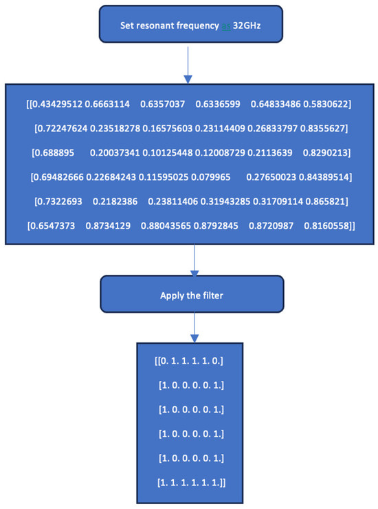 The results from the multilayer perceptron. For a given frequency, a matrix of size 6 × 6 with values in the range of 0–1 was obtained. Such values were subjected to the filter, and the output produced a matrix containing only binary values.