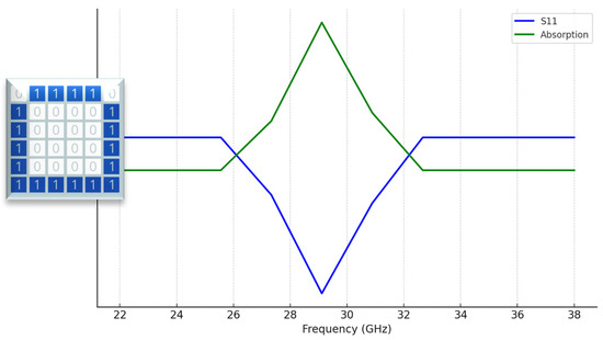 Adjusted absorption parameters: The simulation result for the absorption and S-11 parameters for the unit cell geometry generated by the smart tool. The binary version of the tested metasurface unit cell is shown on the graph.