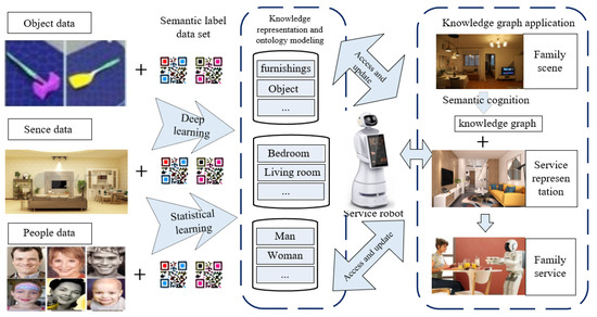 The KnowRob knowledge system [13] was proposed for home service robots to provide robots with a richer knowledge of objects to improve the intelligence of robot task execution. The object knowledge was shared between the system’s modules. The team of Tian et al. [14,15,16] at Shandong University conducted in-depth research on ontology models for multi-domain knowledge sharing and reuse of robotic platforms. Rafferty et al. [17] established a knowledge-based model to determine the user’s intent and reasoning in a home environment. Xiangru Zhu et al. [18] improved the ability of machines to understand the real world through the construction of a multi-modal knowledge graph. Lin et al. [19] discussed the development of knowledge representation in accordance with the difference of entities, relationships, and properties.