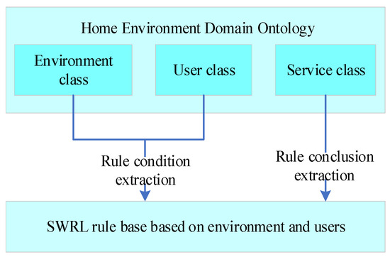 As shown in Figure 3, the template indicates that the service task that the robot should provide is determined according to the environmental, user identity, and behavior information in the home environment. The establishment of the SWRL rule base should consider the conditions of various services and determine the various service modes that may occur in the home environment and the execution logic of the service tasks. An appropriate system and scale will substantially enhance the robot’s ability to provide services.