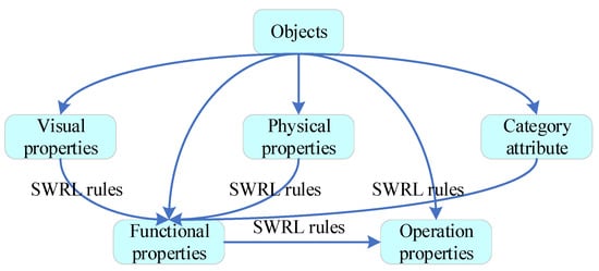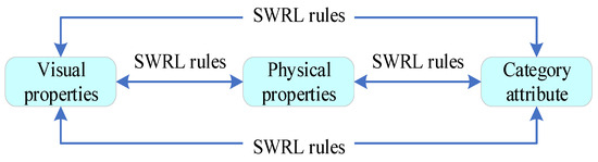 In addition, as shown in Figure 5, a mechanism for acquiring missing category, physical, and visual attributes of the object is established. The reasoning relationship between attributes is formally represented to achieve mutual reasoning for the three attributes and the individual attributes. It includes rules such as: Category (?x, Ball) → hasShape (?x, Sphere), indicates that if the instance ?x is a “Ball”, then it has a visual attribute, i.e., the shape is a “Sphere”; hasShape (?x, cubic) ^ hasWidth (?x, 20) → hasHeightcm (?x, 20) ^ hasLengthcm (?x, 20) means that if the shape of instance x is a cube and its width is 20 cm, then its length and height are also 20 cm.