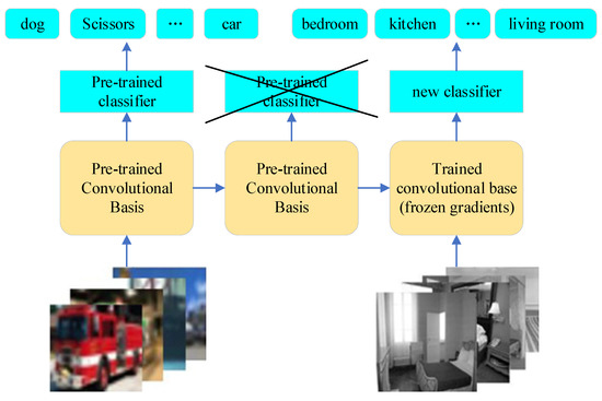 Transfer learning strategies compensate for the shortcomings of convolutional neural networks for these tasks. Transfer learning is a technique that leverages pre-trained models to extract useful features from large and diverse datasets, followed by fine-tuning the model to adapt to a new dataset specific to the current task. As shown in Figure 7, the transfer learning strategy applied in this study enables the model, through pre-training on a large dataset, to learn visual features such as edges, textures, and patterns from various types of images. These features are shared across different domains, while also acquiring weights. After completing model pre-training, the linear classifier of the pre-trained model is removed, and the remaining network layers are used as convolutional layers with their weights frozen. This means that the weights of these layers will not be updated during further training. These frozen convolutional layers retain the general visual features learned from the large dataset. Finally, the new linear layer is used as the classifier, and only the parameter gradients of the last classification layer are updated on the indoor scene dataset, substantially improving the classification accuracy of the model.