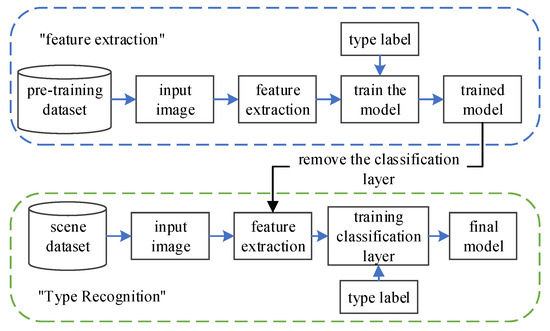 In the feature extraction stage, a convolutional neural network model pre-trained on a large dataset is used to obtain the transfer network parameters. The structure of the model is changed to construct a feature extraction model. The output of the feature extraction model is a feature vector with one dimension containing rich information. In this stage, the features are extracted to distinguish the various categories in different images to perform type recognition of the scenes and tools in the next stage.