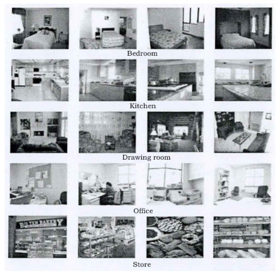 The Scene15 dataset is an extension of the Scene13 scene dataset. Scene13 contains more than 3000 images in 13 categories, including city, country, suburban house, street, highway, high-rise, mountain, coast, forest, living room, bedroom, office, and kitchen. The Scene15 dataset includes images in two additional categories (stores and factories), comprising 15 scenes. Figure 10 shows some examples of the indoor scene category of the Scene15 dataset.