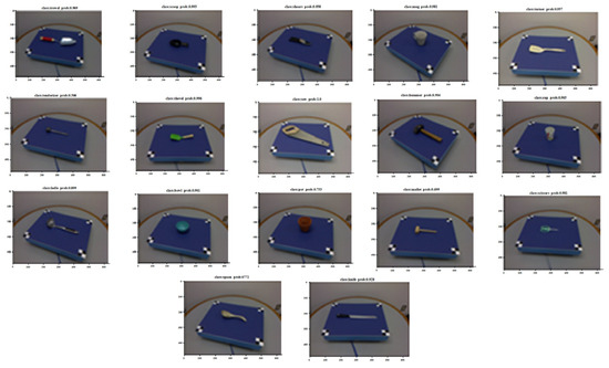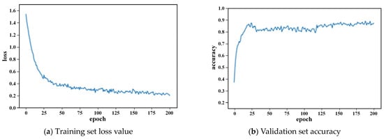 In the experiment of the functional tool classification, the 17 household tools in the UMD part affordance dataset are divided into a training set, validation set, and test set at a ratio of 8:1:1. The hyperparameters for model training include a batch dataset of 256 images, 200 training epochs, and an initial learning rate is 0.001. Figure 13a,b show the loss values of the training set and the accuracy of the validation set during training.