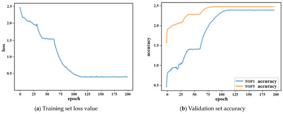 Breakpoint training is used to prevent falling into a local optimal solution during training. The loss value of the training set converges after 125 epochs and stabilizes below 0.5. The accuracy rate of TOP1 in the validation set is about 96%, and that of TOP5 is close to 100%.