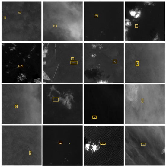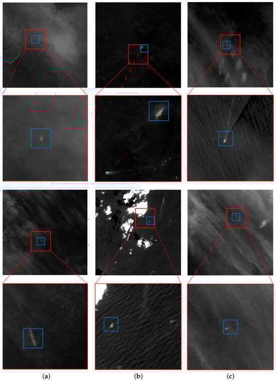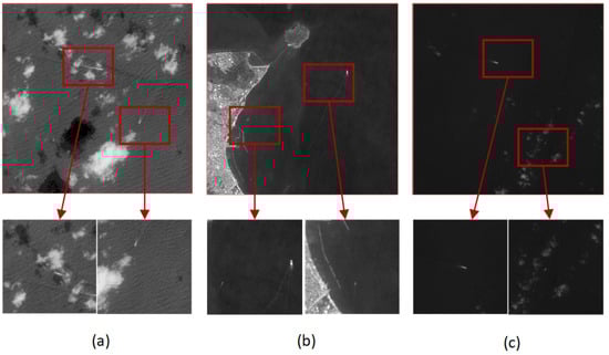 Ship detection has emerged as a crucial research focus in remote sensing, relevant to both civilian and military applications, such as maritime rescue, fishery oversight, and ocean monitoring. Despite considerable advancements in maritime ship detection, there remains a lack of attention toward detecting ships obscured by weather phenomena like clouds and fog []. Meteorological studies reveal that clouds and fog typically cover around 40% of the Earth’s surface []. Optical remote sensing imagery is significantly impacted by these weather conditions, with cloud interference being a prevalent issue. Complex cloud formations, including thin clouds that obscure ship characteristics, can obscure the complete distribution and details of ships in remote sensing images, leading to decreased detection accuracy. Thin cloud cover often reduces the contrast between ships and their surroundings, making it difficult to discern ship features []. As shown in Figure 1a, the weak visual contrast between a ship target and its background complicates detection. Additionally, clouds can partially obscure a ship’s hull, further diminishing its visibility, which presents a challenge for detection algorithms that rely on clear visibility. Figure 1b illustrates how clouds, with their similar shapes, textures, and brightness levels to ships, can introduce noise and distortions that may be misinterpreted as ship targets, leading to false positives and missed detections. Moreover, as depicted in Figure 1c, ships in remote sensing imagery are often small, occupying only a limited number of pixels, making the detection of weak and small targets particularly challenging.