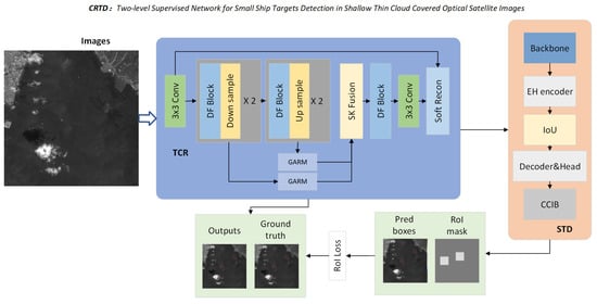 The CRTD network proposed in this article demonstrates significant performance improvements for ship detection tasks in optical satellite images under thin cloud coverage. By integrating the Thin Cloud Removal (TCR) and Small Object Detection (STD) models, this method effectively overcomes the challenges posed by low contrast and occlusion in thin cloud-covered images, enabling accurate detection of ship targets in cloud and fog interference conditions. The experimental results show that the TCR module successfully enhances the clarity and contrast of images in the preprocessing stage, while the STD module excels in object recognition. Through a dual-level supervision mechanism, the combined efforts of the TCR and STD modules lead to improved performance, especially in thin cloud coverage scenarios, thereby enhancing ship detection accuracy. Further experimental comparisons demonstrate that CRTD outperforms popular detection models such as YOLOv5 and Faster R-CNN in terms of accuracy and recall. In practical detection scenarios, CRTD effectively reduces false positives and false negatives. Ablation experiments validate the contributions of various components (such as TCR, GARM, and CCIB), confirming that each module plays a crucial role in the overall performance improvement. CRTD performs particularly well in detecting weak targets under complex weather conditions. However, this study has certain limitations. The relatively small sample size and challenges in obtaining labeled data for small targets under varying environmental conditions may limit the generalizability of the results. While CRTD demonstrates strong performance, particularly under thin cloud cover, there is potential for further improvement. Future work will focus on expanding the dataset to include a broader variety of ship types, weather conditions, and geographic regions, which will help to further validate the robustness and generalizability of the network. Additionally, efforts will be made to enhance performance in more complex weather scenarios, such as heavy clouds, fog, and low-resolution satellite imagery.
