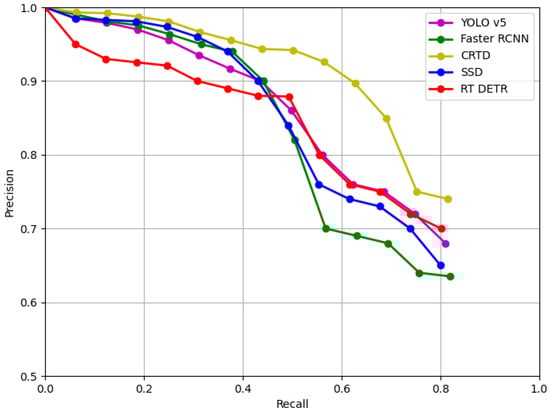 Precision–recall curve for ship detection: comparison of different methods. This curve plots precision (%) against recall (%), where higher precision indicates fewer false positives, and higher recall reflects better identification of true ship targets. The area under the curve (AUC) serves as a key metric for model performance, with a larger AUC indicating better detection accuracy across thresholds.