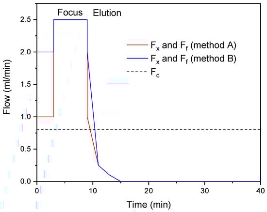 The spacer material for the channel, made of poly(tetrafluoroethylene) (PTFE), had a thickness of 490 μm, with channel dimensions extending 26.5 cm in length and tapering from a width of 2.1 cm to 0.6 cm. Regenerated cellulose membranes with a molecular weight cutoff of 10 kDa (Superon GmbH, Dernbach, Germany) served as the accumulation barrier. Flow rates were precisely managed using an isocratic pump (1200 series, Agilent Technologies, Santa Clara, CA, USA) equipped with a vacuum degassing unit. Detection was carried out with a DLS detector (DynaPro NanoStar, Wyatt Technologies, Santa Barbara, CA, USA) and a refractive index (RI) detector (Optilab T-rEX, Wyatt Technology Europe GmbH, Dernbach, Germany), both operating at a wavelength of 658 nm.